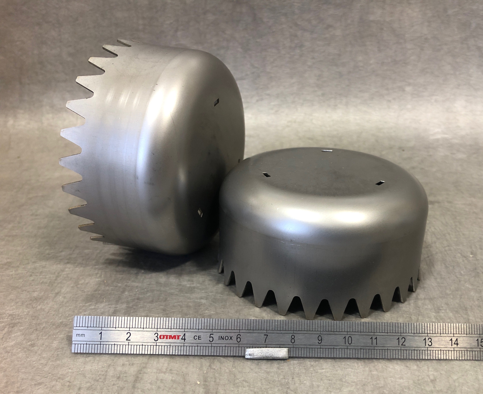 Voici un exemple de pièces réalisées par emboutissage en inox 304L pour un client réalisant des échangeurs thermiques. Ces cloches d'échangeur thermiques en inox 304L ont été réalisées par emboutissage puis découpe laser cinq axes.